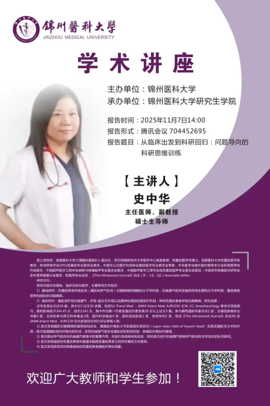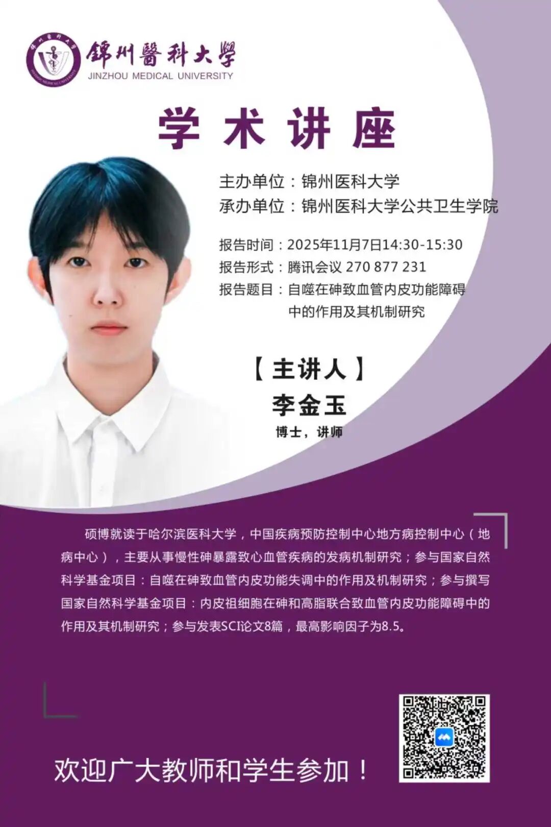 为加强学术交流,提升学术水平,11月7日,由学校科技处主办,研究生学院、第一临床医学院、公共卫生学院、食品与健康学院、智能医学学院承办的学术讲堂按期举行,特邀请专家为大家带来精彩的学术讲座,希望全校师生踊跃参加!