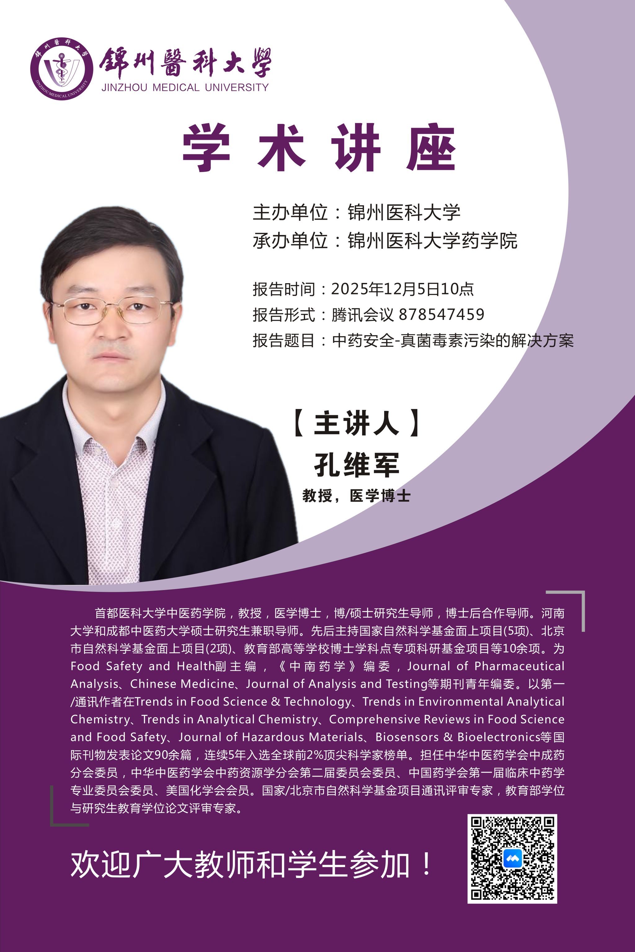 为加强学术交流,提升学术水平,12月5日,由学校科技处主办,公共卫生学院、药学院承办的学术讲堂按期举行,特邀专家为大家带来精彩的学术讲座,请全校师生踊跃参加!